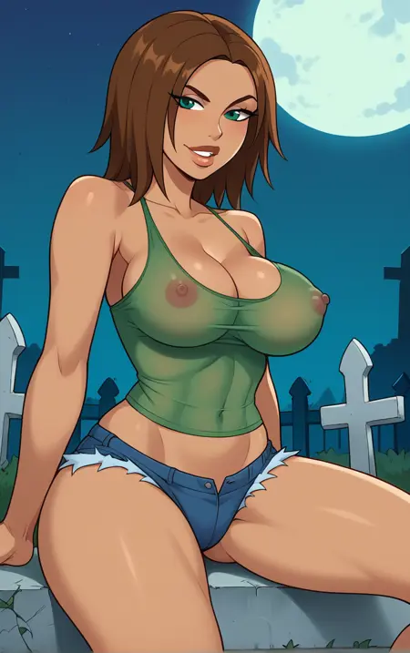 1girl, brown hair, colored skin, dark-skinned female, green eyes, lips, medium hair, dark skin, nude, nipples, large breasts, medium breasts, navel, dark nipples, pussy, makeup, lipstick, short hair, completely nude, breasts, female pubic hair, freckles,
