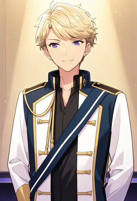narukashi, 1boy, male focus, solo, purple eyes, blonde hair, short hair, swept bangs, jewelry, earrings, knights uniform, shirt, black shirt, collared shirt, jacket, white jacket, long sleeves, open jacket, open clothes, aiguillette, sash, blue sash, gloves, fingerless gloves, black gloves, pants, blue pants, striped pants, striped, boots, black footwear, cross-laced footwear