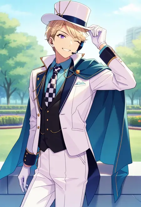 narukashi, 1boy, male focus, solo, purple eyes, blonde hair, short hair, swept bangs, jewelry, earrings, headset, hat, top hat, white headwear, shirt, blue shirt, collared shirt, necktie, checkered necktie, checkered clothes, vest, black vest, jacket, white jacket, open jacket, open clothes, long sleeves, cape, blue cape, gloves, white gloves, pants, white pants,