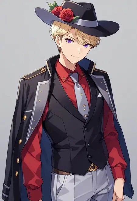 narukashi, 1boy, male focus, solo, purple eyes, blonde hair, short hair, swept bangs, jewelry, earrings, formal, shirt, dress shirt, white shirt, bowtie, vest, blue vest, jacket, red jacket, long sleeves, belt, red pants