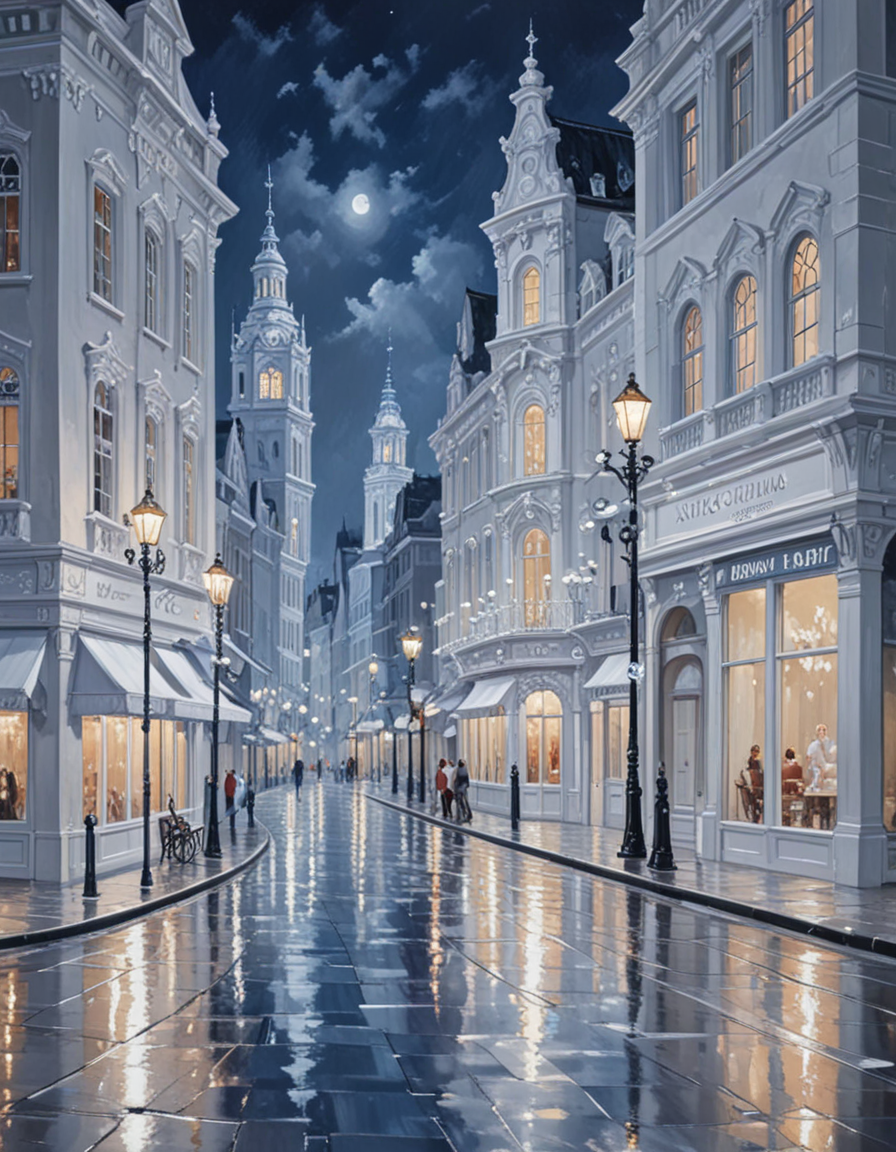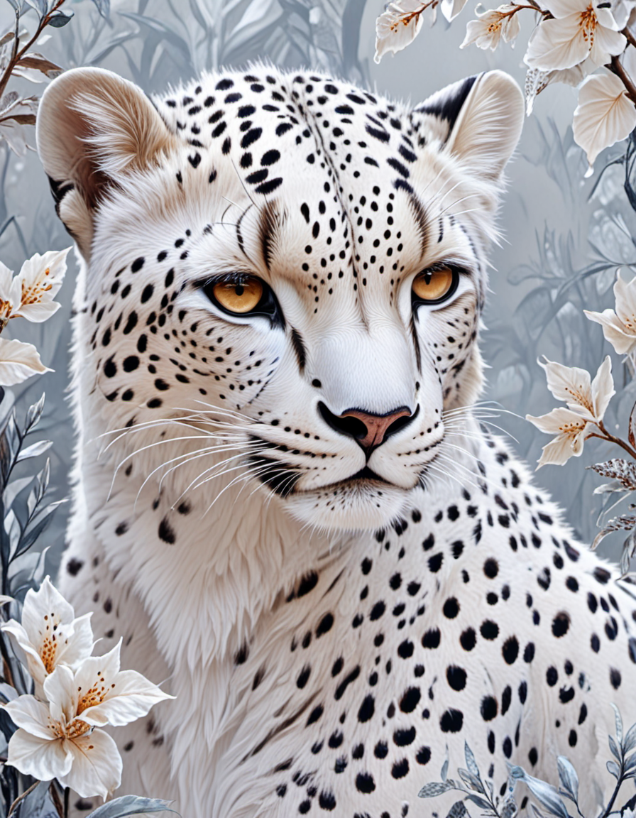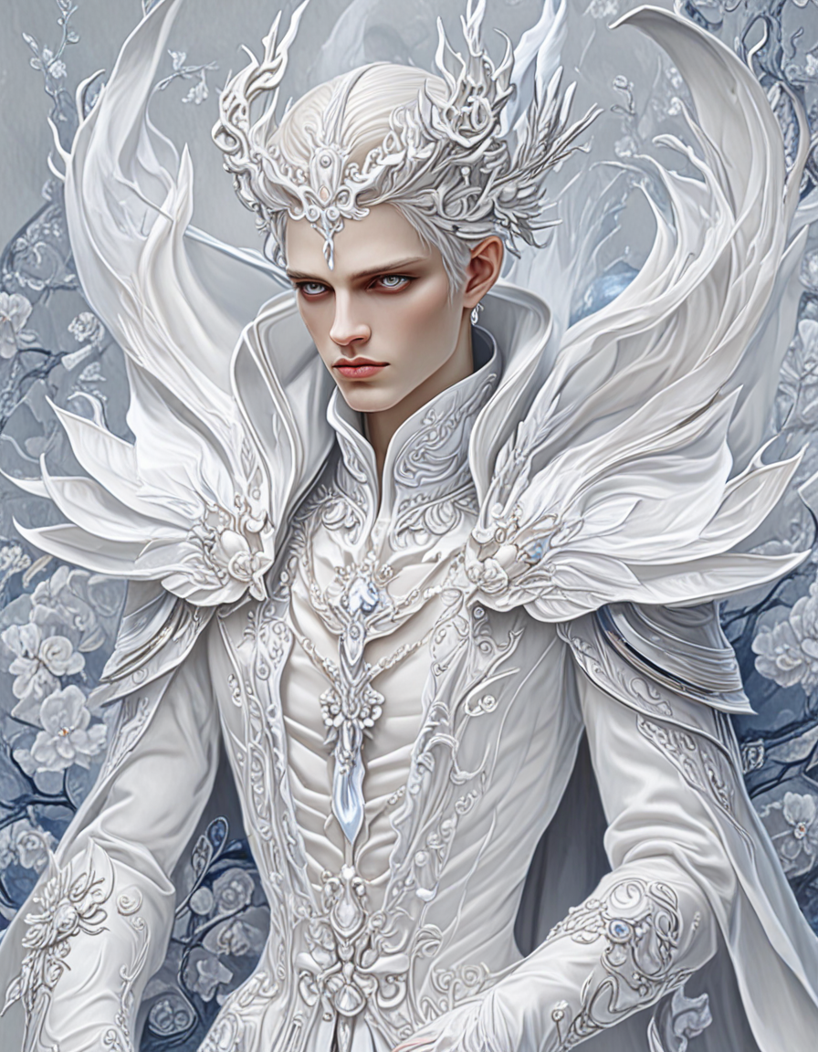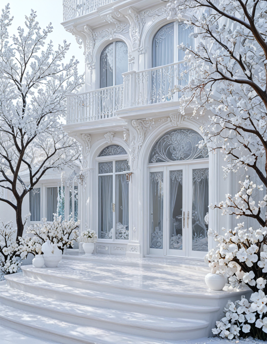 럭셔리하고 우아함이 가득한 이미지를 생성하세요. 기본 색상은 흰색이며, 연한 파랑 회색 악센트를 사용하세요. 이 스타일은 사진 사실주의와 2D 예술을 혼합합니다.