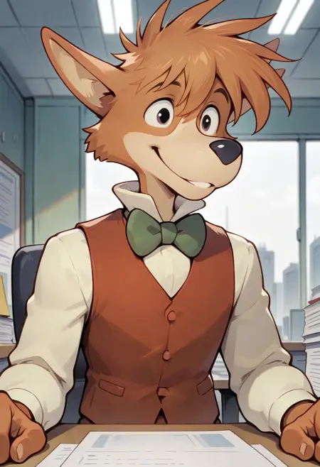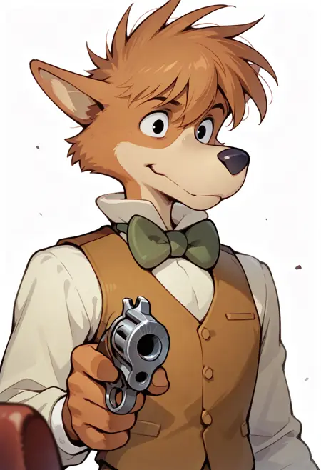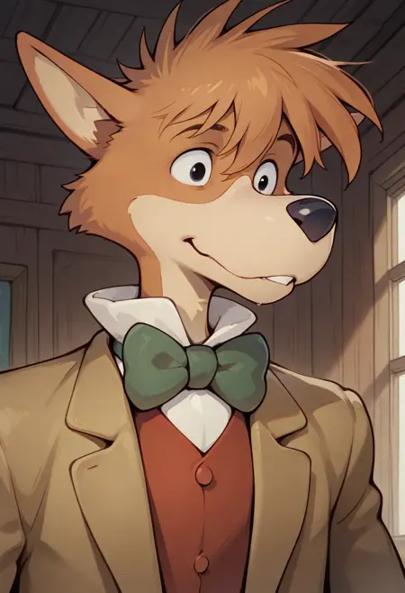 Pony: score_9, score_8_up, score_7_up, best quality, hires, male, sherlock hound, furry, white shirt, red vest, bowtie, brown pants, messy hair, solo, 1boy, ...your tags...