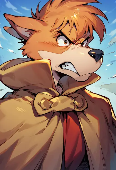 Pony: score_9, score_8_up, score_7_up, best quality, hires, male, sherlock hound, furry, white shirt, red vest, bowtie, brown pants, messy hair, solo, 1boy, ...your tags...