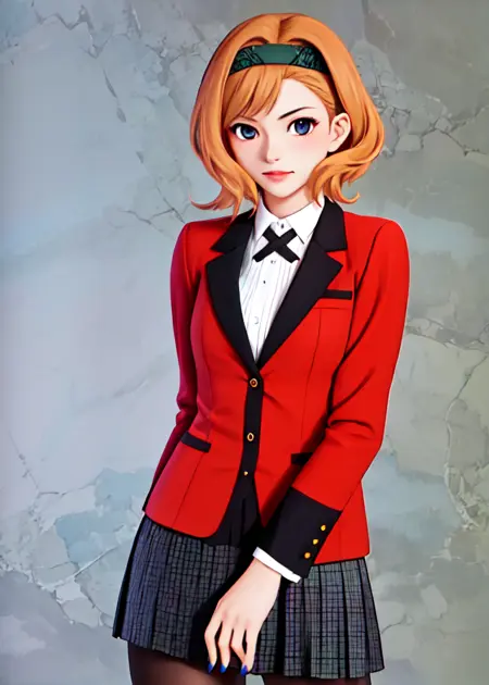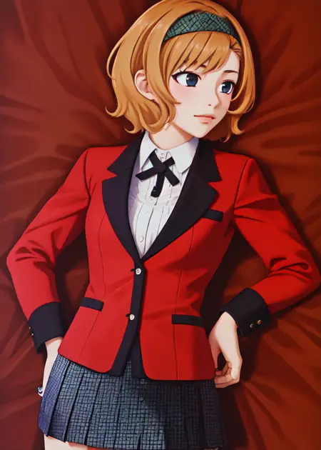 red jacket, white shirt, black skirt, black socks