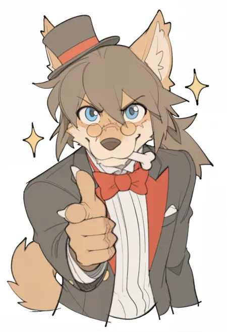 Useful tags: dog boy, 1boy, two-tone fur, brown hair, dog ears, animal nose, blue eyes, dog tail, scar on face
