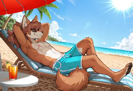 Useful tags: dog boy, two-tone fur, brown hair, dog ears, animal nose, blue eyes, dog tail, scar on face