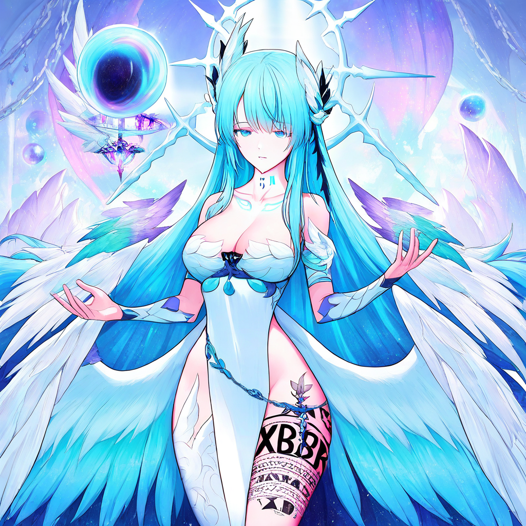 reginleif7k, 1girl, solo, breasts, bangs, very long hair, aqua hair, pelvic curtain, hair ornament, wings, strapless, white feather dress, collarbone, cleavage, wings, feather wings, multiple wings, , halo, tattoo, leg tattoo, neck tattoo,