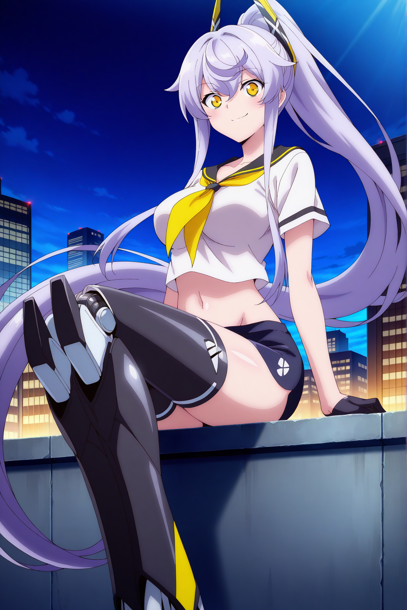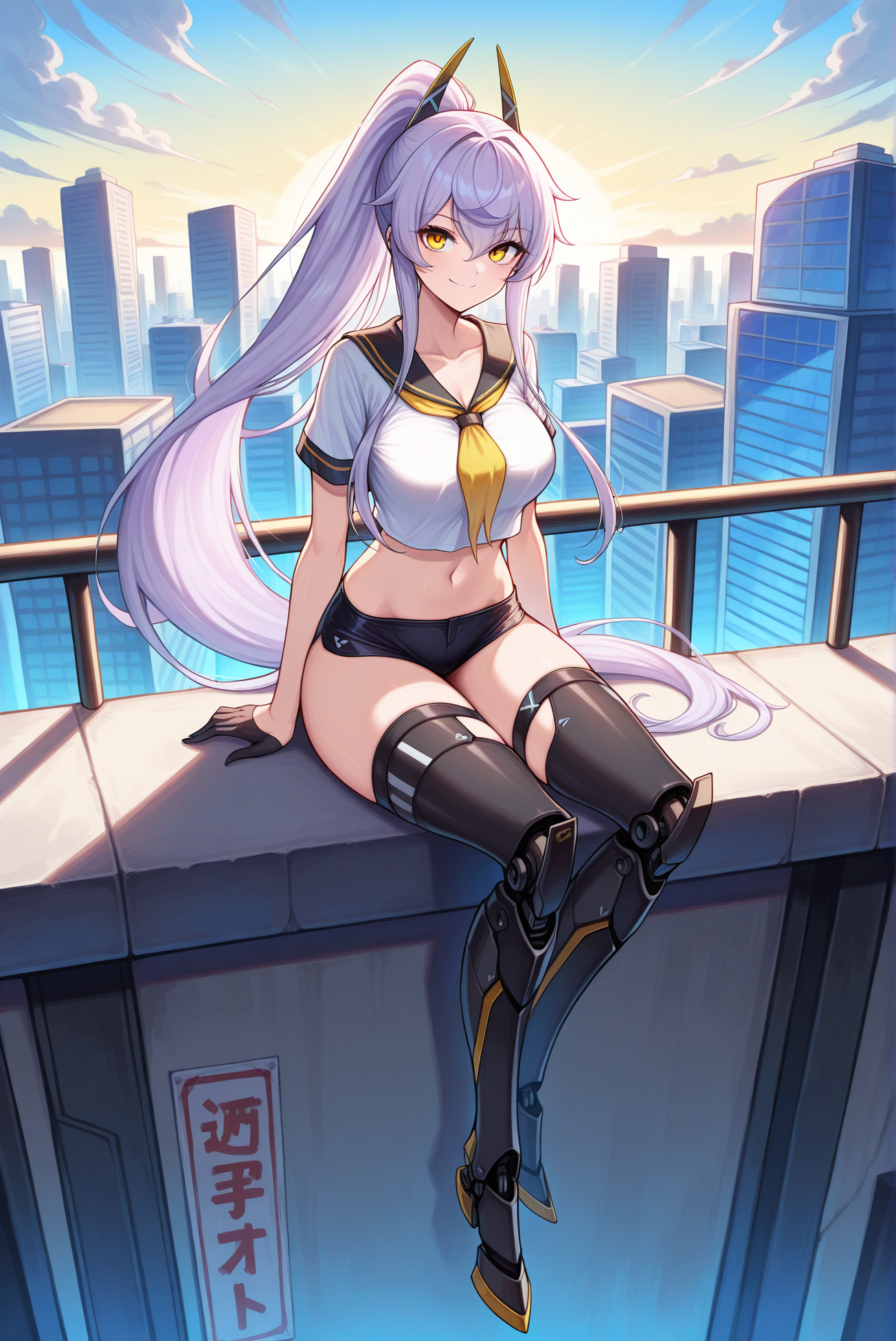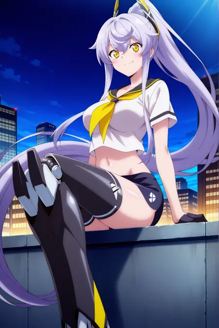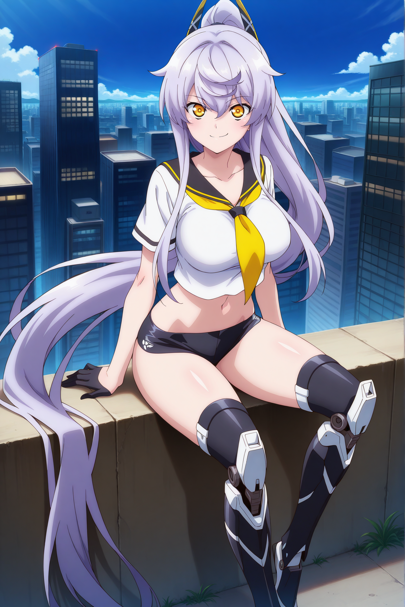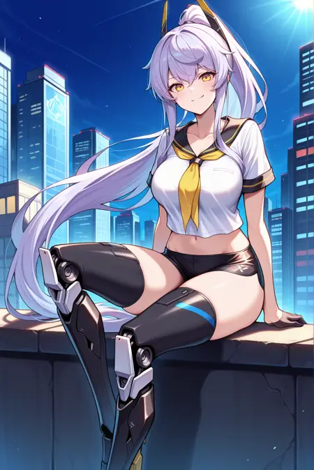 服装: 短上衣,黑色水手领,黄色领巾,黑色超短裤,黑色手套,半掌手套,白色衬衫,机械腿