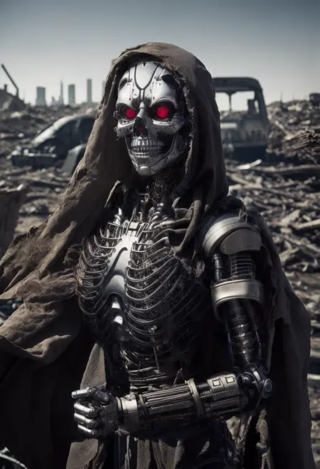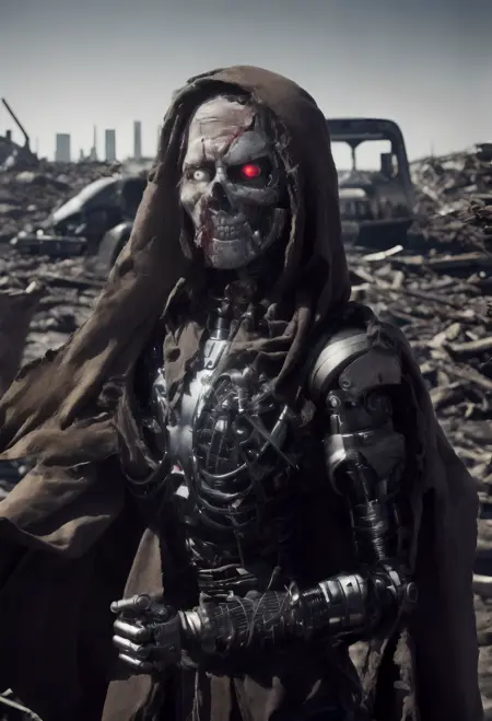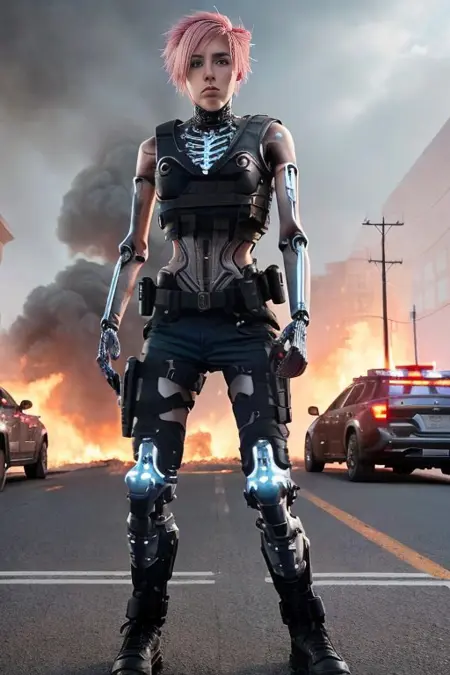 数多くのターミネーターおよびサイボーグの画像(人間、部分的に人間、完全に機械など)を用いて学習させました。このモデルは、大多数のハード・サイエンスフィクションモデルよりも機械的なスタイルのロボットを作成でき、人間のキャラクターに手の代わりにサイバーパーツを追加するなど、インペイントに非常に優れています。 背景に後崩れの世界や煙、炎などを生成することがあります。しかし、キャラクターの関節部分に円形の空洞形状を頻繁に生成してしまうという気になる癖があるため、正しい形にするためには頻繁にインペイント処理が必要です。