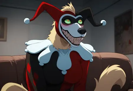 female hyena, furry, anthro, jester outfit, sharp teeth, tan fur, green sclera, red eyes, fangs, tail, black nose