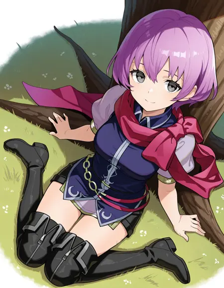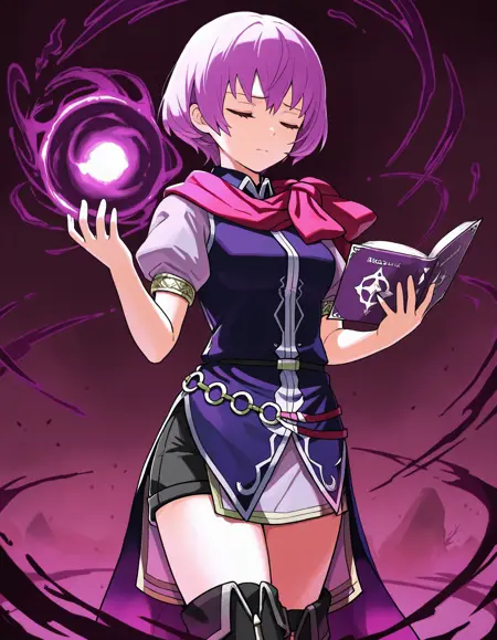 彼女の典型的な外見には「スカーフ、紫のドレス、黒いベルト、Oリングベルト、黒いショーツ、太ももブーツ」を追加してください。