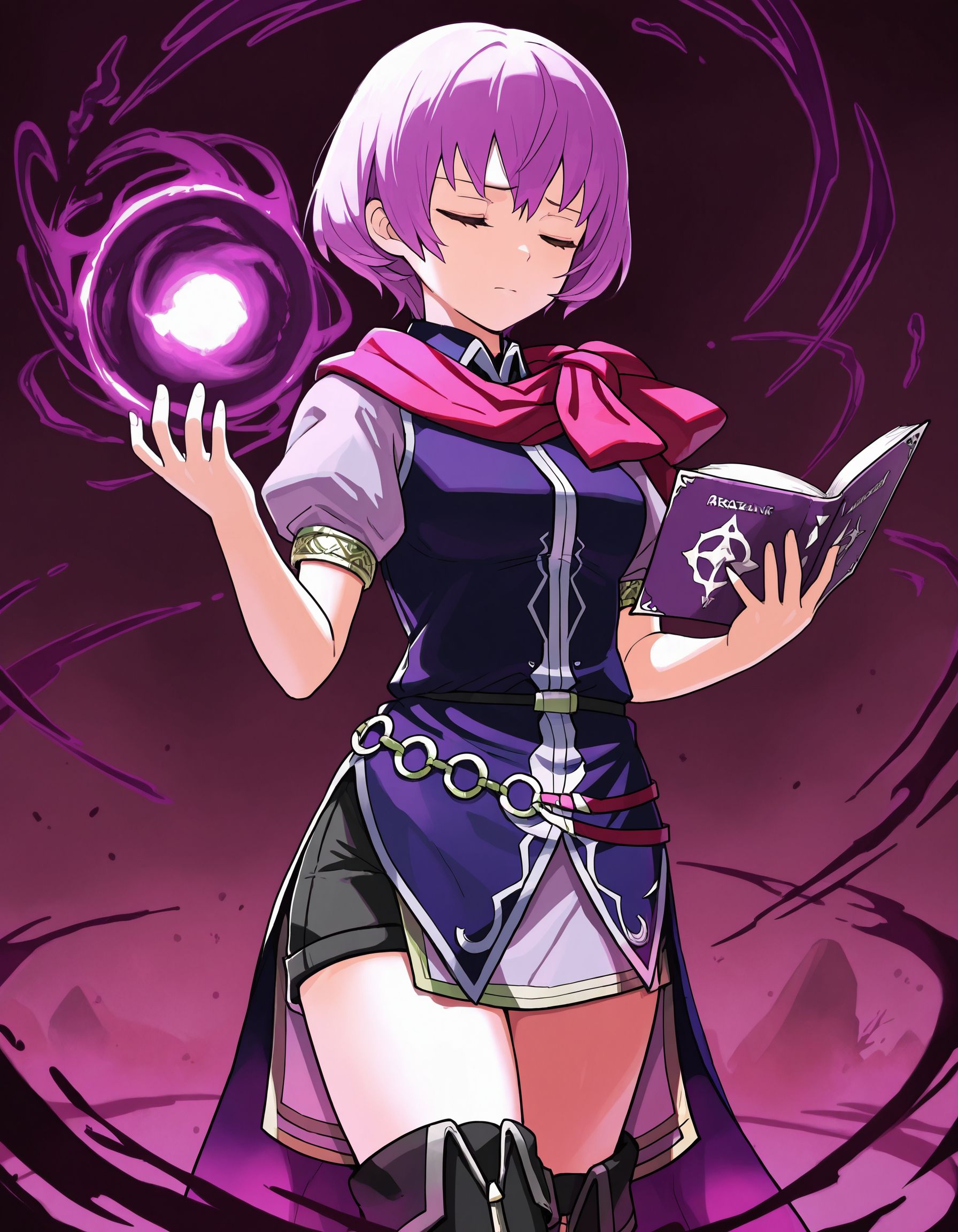 그녀의 전형적인 외모를 위해 "스카프, 보라색 드레스, 검은 벨트, O링 벨트, 검은 숏츠, 허벅지 부츠"를 추가하세요.