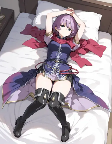 Add "scarf,purple dress,black belt,o-ring belt,black shorts,thigh boots" for her typical look.