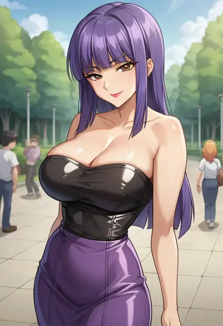肩出し、鎖骨、ストラップレス、胸元強調、紫のスカート、黒のチューブトップ、シャツをイン