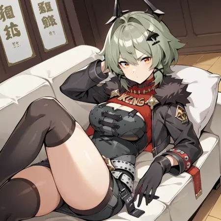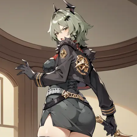 ボディコンドレス、ブラックドレス、ブラックシンハイ、クロップドジャケット、ブラックジャケット、コルセット、クリーヴァジュカットアウト、ヘアクリップ、ベルト、星(シンボル)、ファートリム、ファートリムジャケット、レッドシャツ、タートルネック、ブラックグローブ、レッドカラー、ゴールドネックレス、バイクショーツ、ミニスカート、サイドスリット