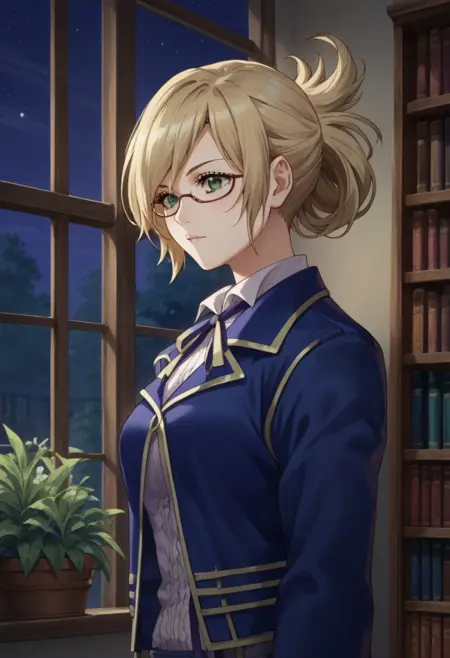 arialin, 1girl, glasses, blonde hair, green eyes, uniform, pantyhose, skirt, jacket, blue jacket, belt, blue skirt, pencil skirt, tegami uniform, folded ponytail, ribbon, neck ribbon