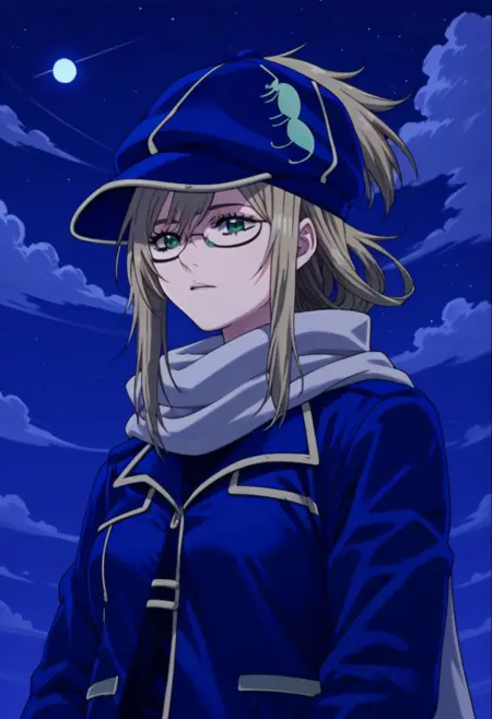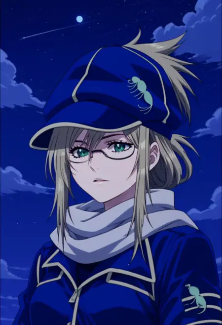 arialin, 1girl, glasses, blonde hair, green eyes, uniform, folded ponytail, bee uniform, hat, blue hat, scarf, white scarf,