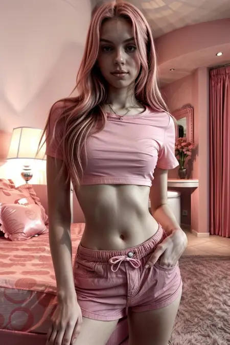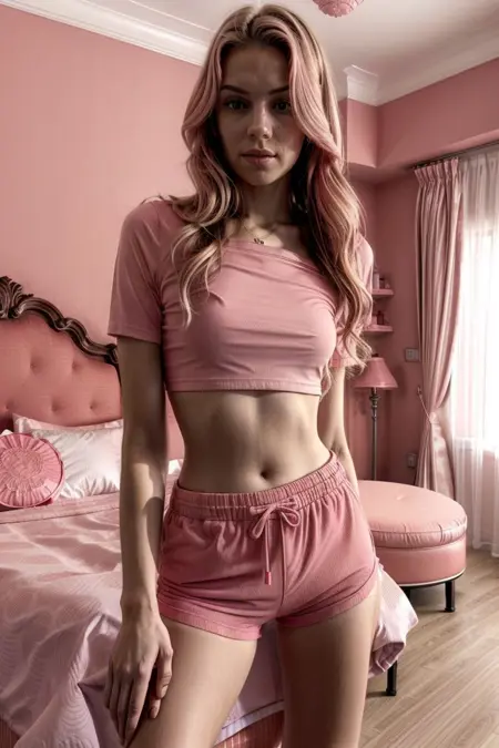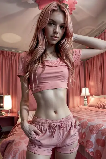 このLoRAは、「ピンクさ」がやりすぎたベッドルームを生成します。