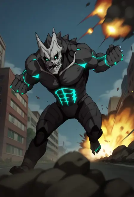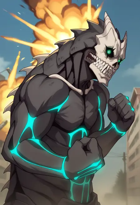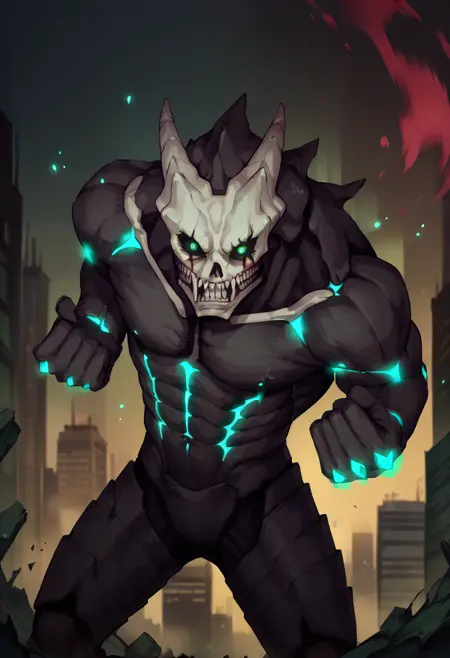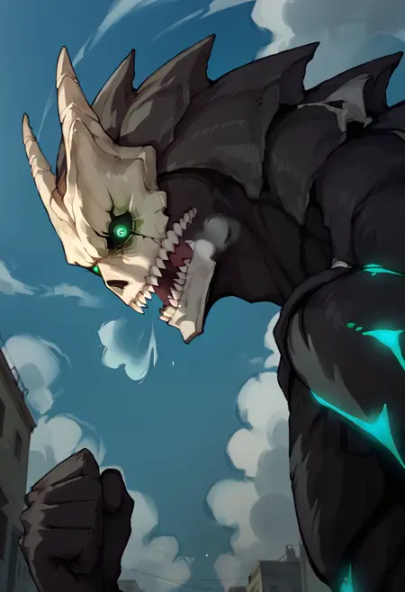 kaijuu no8, black skin, skull mask, glowing eyes, sharp teeth, black sclera, kaijuu,