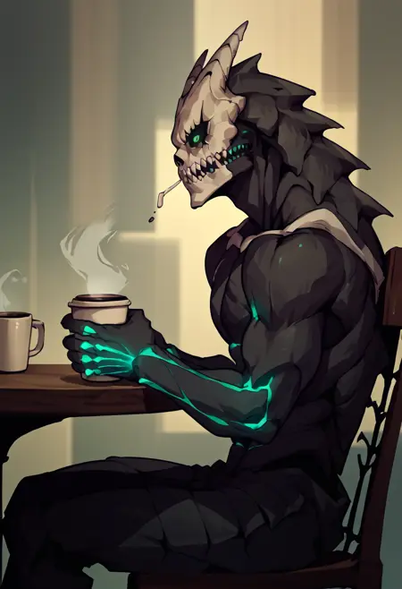 kaijuu no8, black skin, skull mask, glowing eyes, sharp teeth, black sclera, kaijuu,