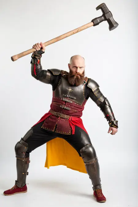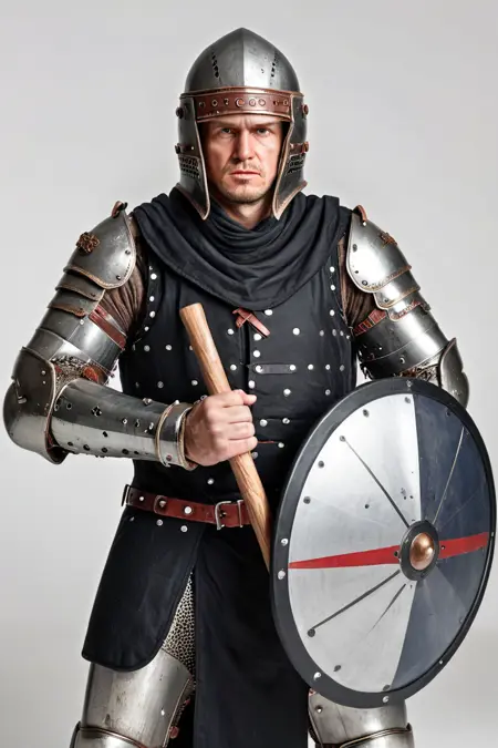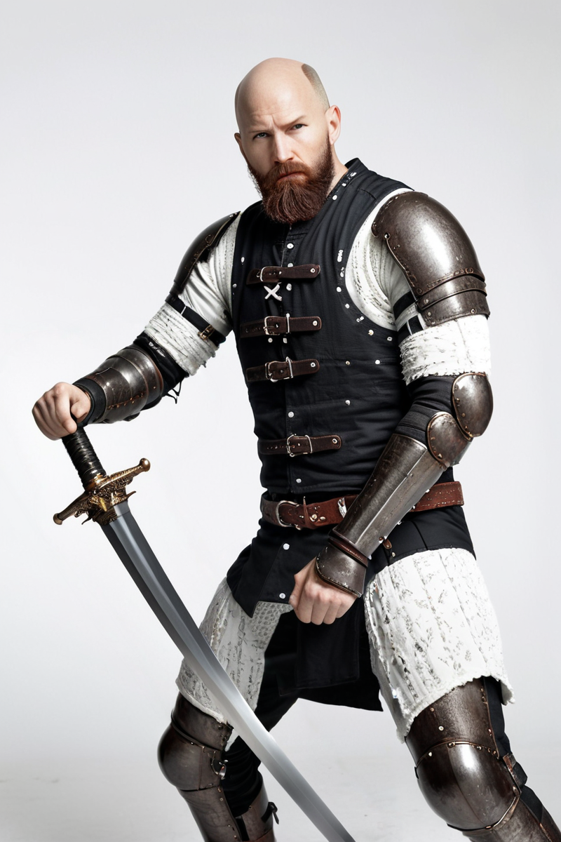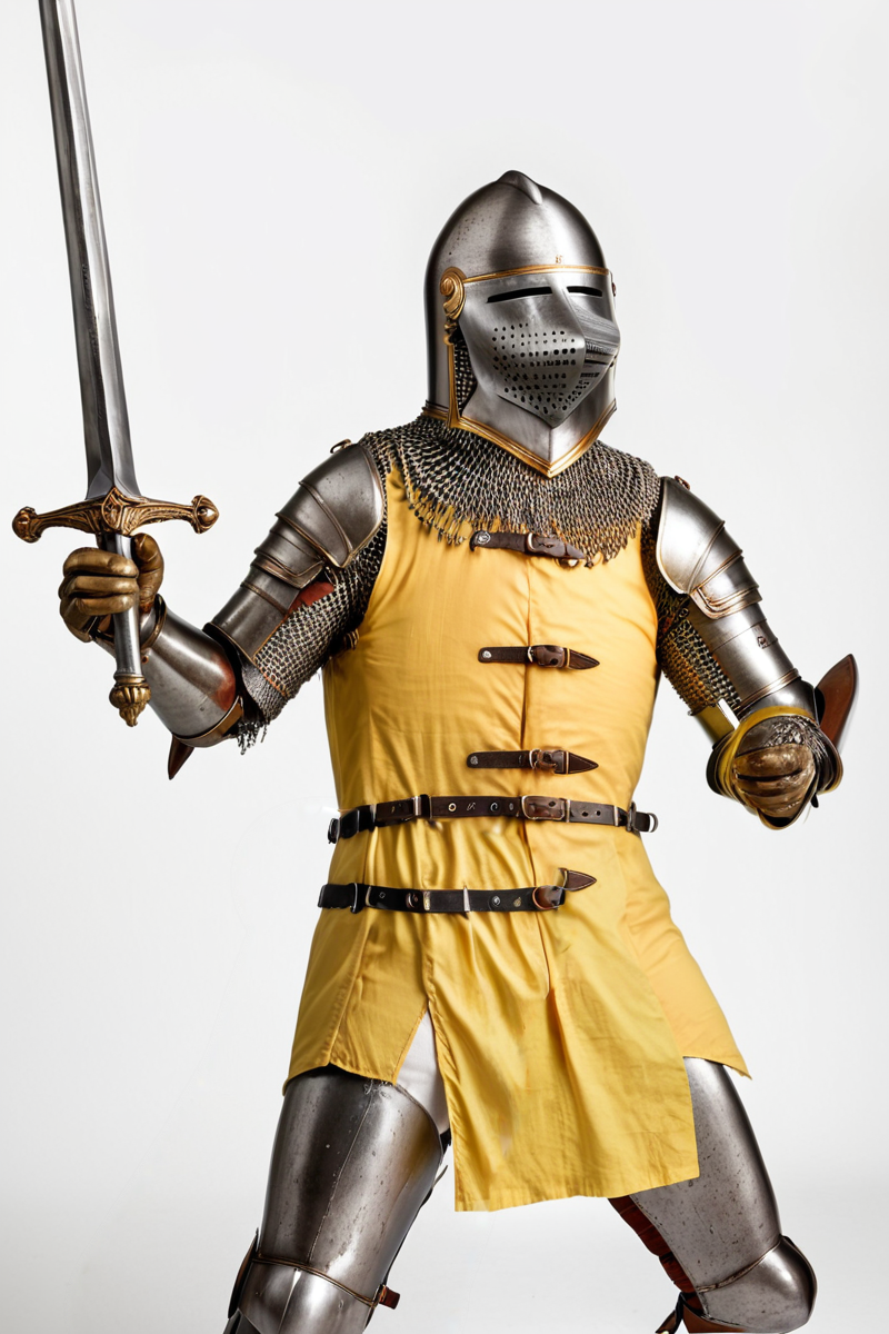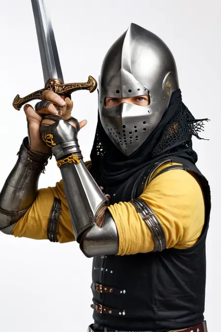 Additional Keywords: multi-colored armor (specify colors afterwards, e.g.: black and yellow armor), pauldron, vambraces, greaves, chainmail under armor, undershirt, patterns on clothing, studded.