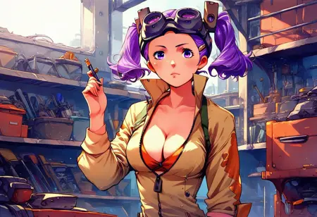 Wahanly_Shume, 보라색 머리카락, 보라색 눈, 더블테일, 머리장식, 점프수트, 팔을 걷어붙인 상태, 안경, 머리에 안경, 벨트