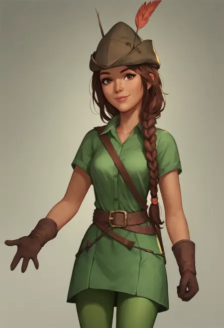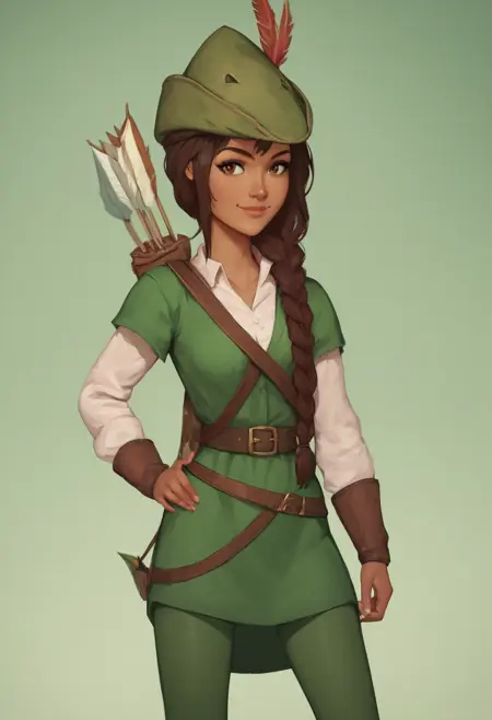 belt, hat, green tunic, green tights, brown tunic, dark green tights,