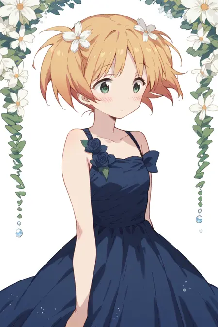 yuu, 1girl, solo, short twintails, hair ornament, green eyes, blue dress,