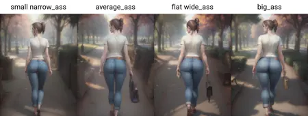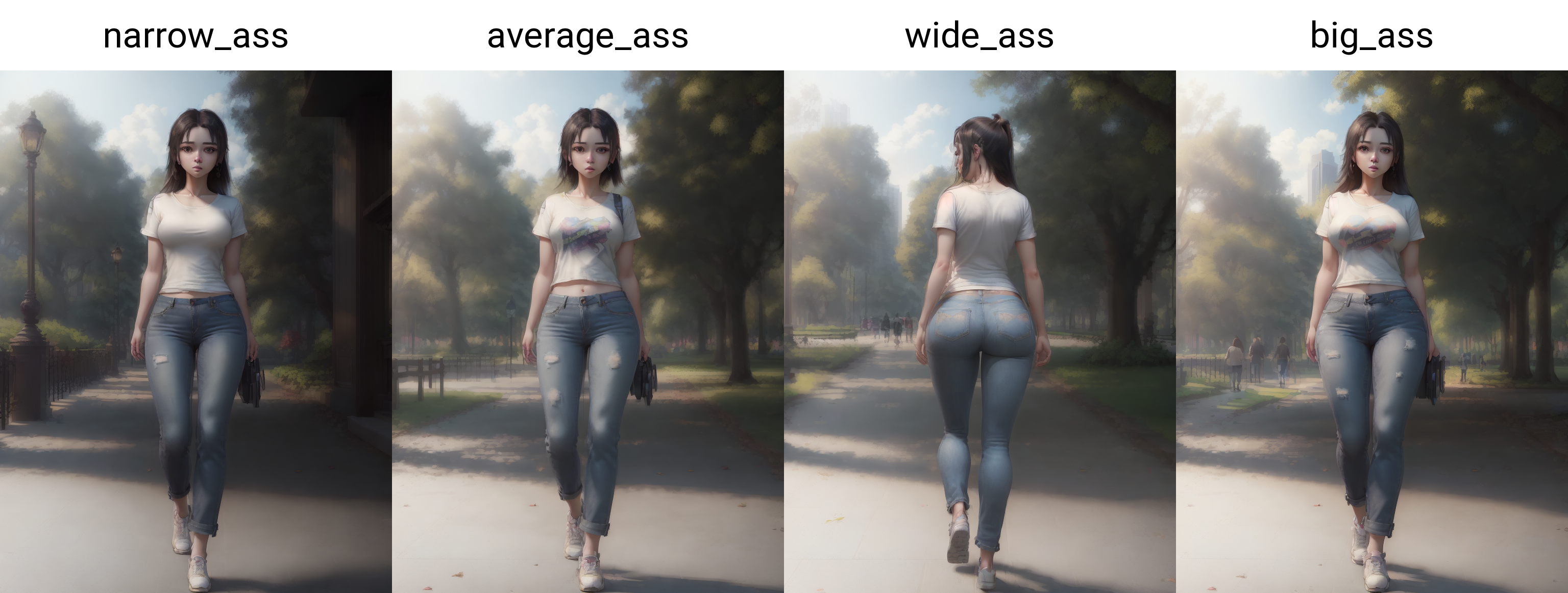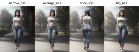 在胸型方面,带下划线的基本提示词是正确的。但若要获得更精确的效果、达成我预期的结果,建议搭配辅助提示词使用。例如,当我输入 (flat chest) 时,通常指的就是扁平胸部,但大多数检查点和胸型 LoRA 实际上会生成我看来“偏小”的胸部。要解决这个问题,只需将 (flat_chest) 与 (no bewbs) 一起使用即可。小、中、大胸型非常直观。而“huge”“giga”“crazy”单独使用时,往往看起来非常接近,但它们的本意不同:“huge”是仅指真实的大胸;“giga”是夸张的假胸;“crazy”自然就是极度夸张、离谱的了。正确用法是使用 (big giga_breasts) 和 (gigantic crazy_breasts)。不过请注意,要做好用负向提示词处理“big/wide/thick hips”的准备,除非你本意就是如此。