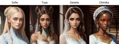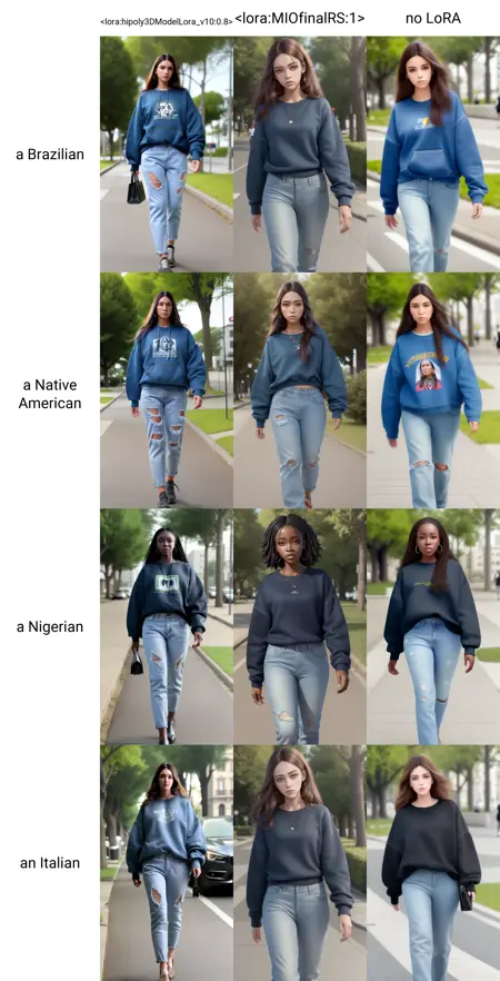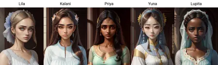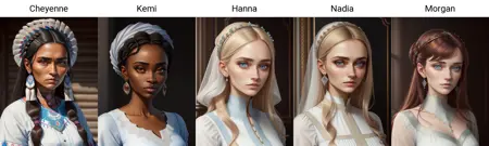As I said, there's 19 girls in all and each is slightly different even if sometimes their faces tend to be similar. Most have a clear nationality that comes through in renders even without prompting such as Cheyenne (Native American), Lupita (Latina), Priya (Indian), what I mean by this is that quite often Cheyenne has deerskin clothes, if you put a dress on Lupita it likes to look like a quinceanera gown, and Priya leans towards a sari.