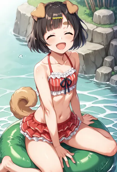small breasts,brown eyes,thick eyebrows,short hair,brown hair,black hair,hair ornament,hairclip,dog ears,dog tail,