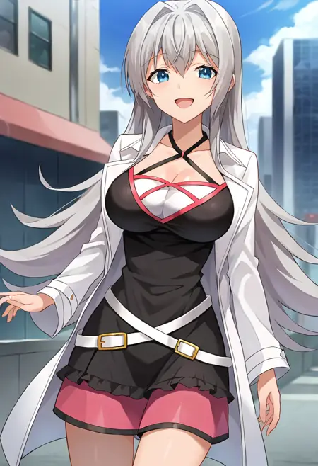 score_9, score_8_up, score_7_up, masterpiece, source_anime 1girl, ct_earle, grey hair, blue eyes, long hair, large breasts, black short dress, halterneck, white belt, pink skirt, labcoat, long sleeves, looking at viewer, outdoors, depth of field, city,
