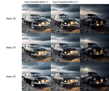 1956年から1975年まで、社会主義的チェコスロバキアで製造されたタトラ603は、当時主に政府関係者とそのドライバーによって使用されていました。現在では高級ヴィンテージカーです。768x768 SD、1024x1024 SDXL(さまざまな比率や解像度でも可)。ウェイトを0.15〜0.8(SD用)、SDXL用は1で実験してみてください。SDモデルには特定のトークンは必要ありません。ただ、どんな車でも素晴らしくしてください!トークン tatra603 も有効です。
