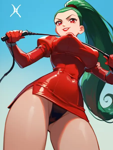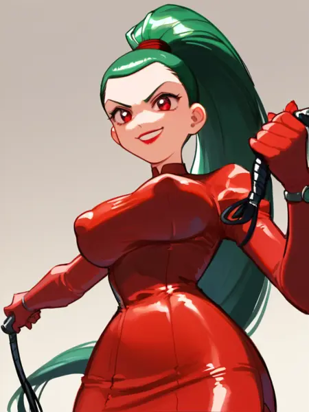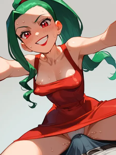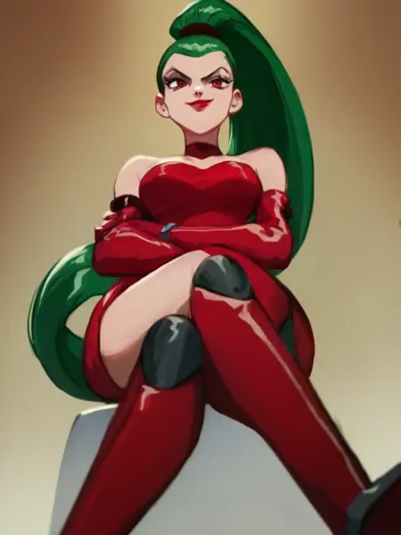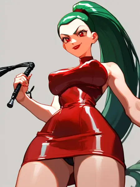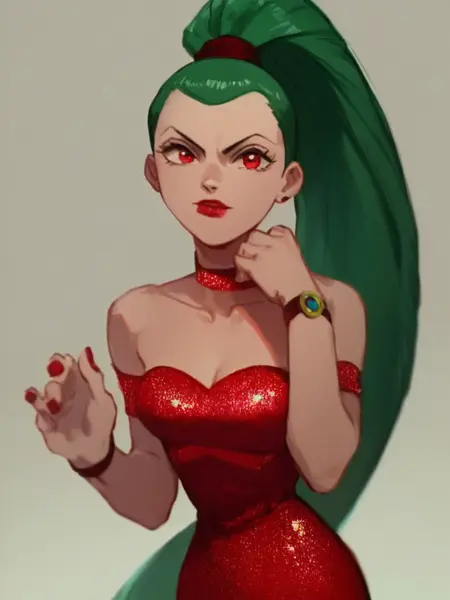 long hair, green hair, red eyes, lipstick, ponytail, red dress,