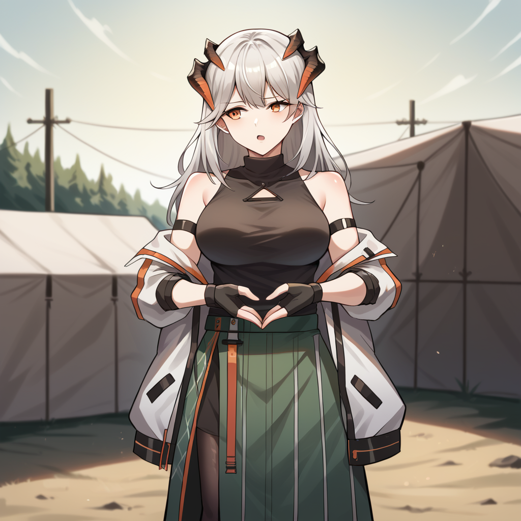 Sar_StrH, 黑色过膝袜, 黑色衬衫, 无袖衬衫, 露肩, 无指手套, 绷带, 黑色手套, 手臂绑带, 露肩夹克, 白色夹克, 开襟夹克, 两色裙, 战术裙, 绿色裙, 长裙, 侧开叉,