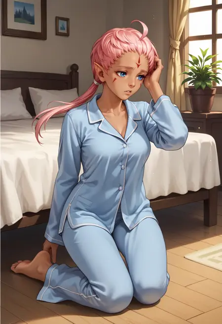 デフォルトの外見: defEna、黒肌の女性、ピンク色の髪、ロープニーテール、額のマーク、顔のマーク、青い目、尖った耳、イヤリング、チャイナドレス、長袖、肩のカットアウト、ベルト、白いズボン