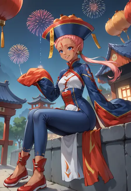 秋の戦術家(FEH): halEna、黒肌の女性、ピンク色の髪、ロープニーテール、額のマーク、顔のマーク、青い目、尖った耳、イヤリング、清代冠帽、御符、中国服、広い袖、袖が指先より長い、骨盤カーテン、青いレギンス