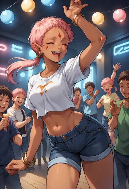 カスタム衣装: defEna、黒肌の女性、ピンク色の髪、ロープニーテール、額のマーク、顔のマーク、青い目、尖った耳