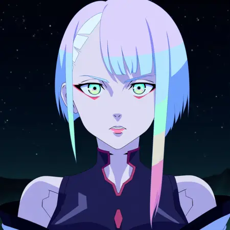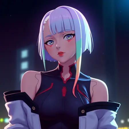short hair, lucy (cyberpunk), 1girl, bangs, multicolored hair, red eyeliner, jacket, makeup, cyberpunk, white hair, bare shoulders, red lips, multicolored eyes, bodysuit, off-shoulder jacket, breasts, parted bangs, night, open clothes, off shoulder, blunt bangs