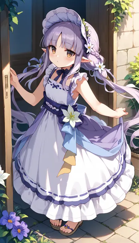 elf, flower, frilled dress, frills, hair flower, hair ornament, hat, long hair, low twintails,