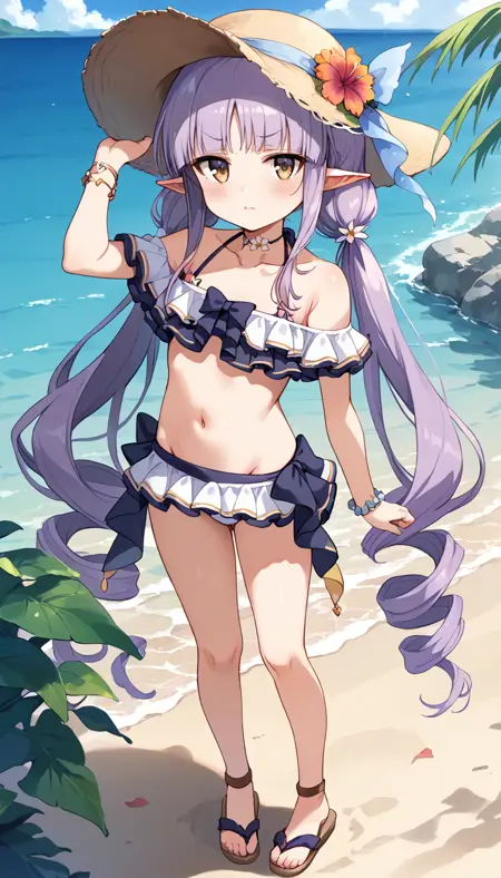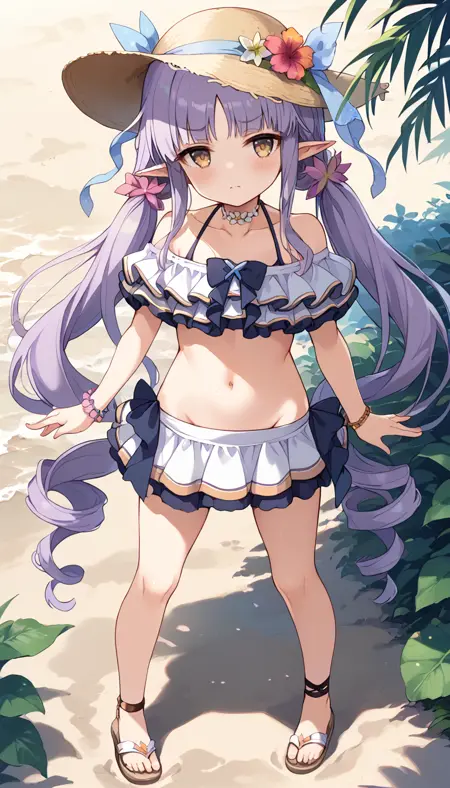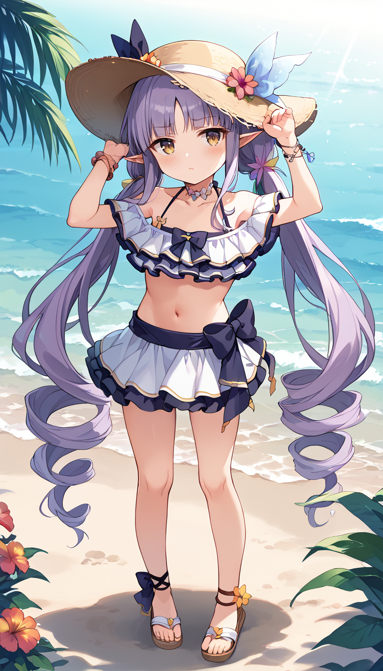 bikini, bikini skirt, blush, bow, bow bikini, bracelet, brown hat, choker, collarbone, elf,