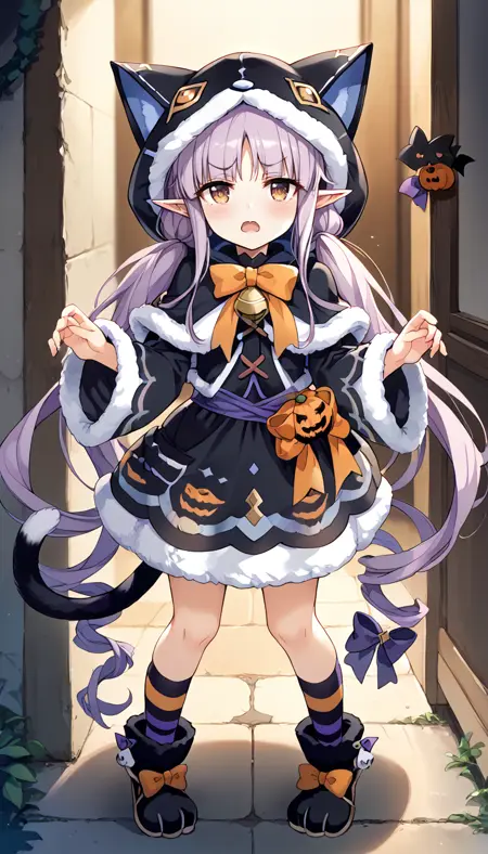 long hair, long sleeves, low twintails, open mouth, orange bow, paw shoes, pointy ears, purple bow, purple hair,