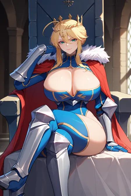 Add "crown, blue leotard, sleeveless, cleavage cutout, elbow gloves, blue gloves, blue thighhighs" for her typical look.