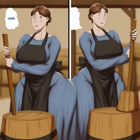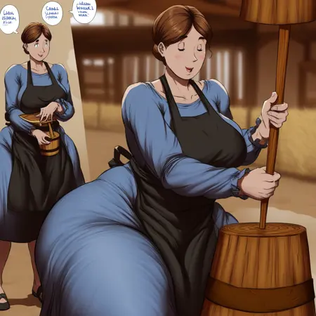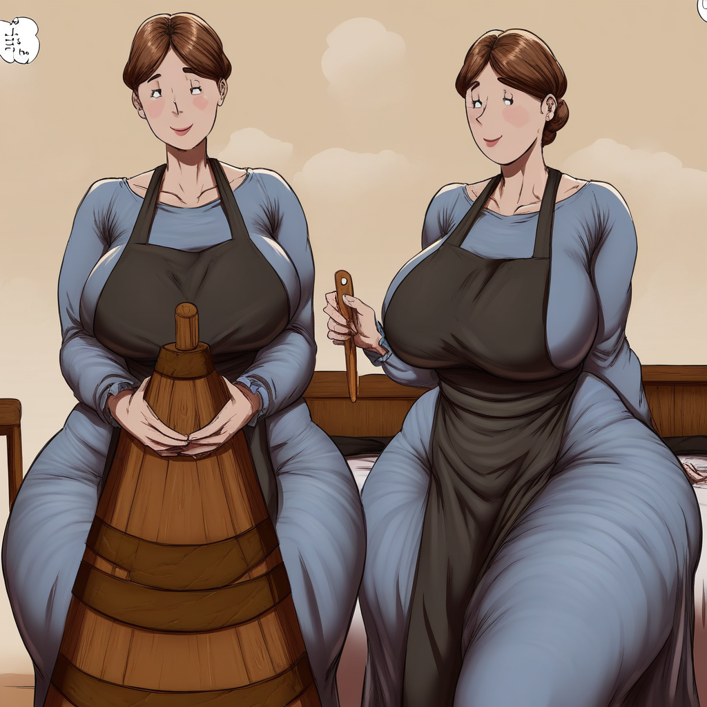 brown hair, blue dress, black apron, big breast, wide hips, thick thighs, mature female,