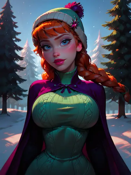 좋은 프롬프트: 긴 머리, 파란 눈, 녹색 드레스, 두 개의 땋은 머리