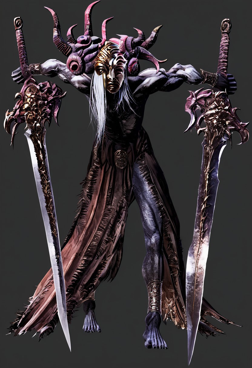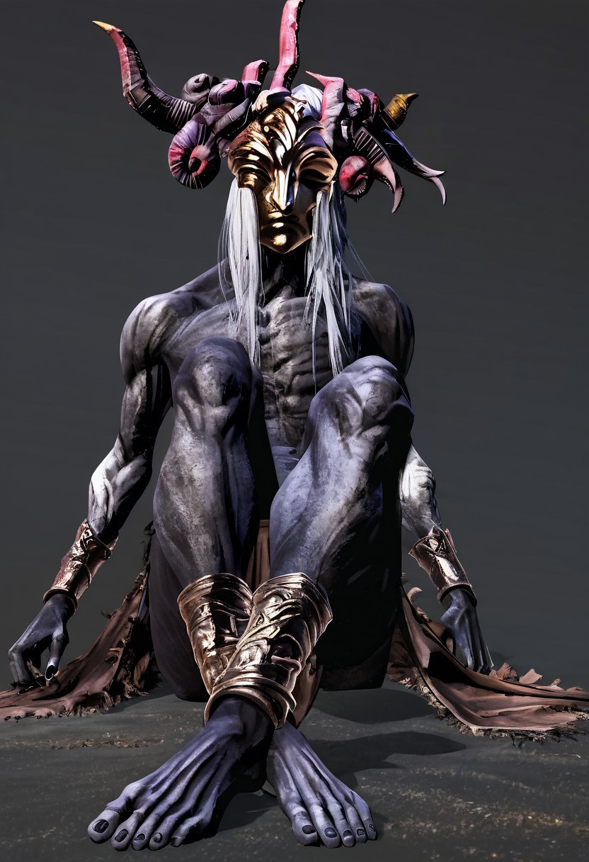 | Trained Words | one eyed mask, black nails, long hair, monster, faceless, humanoid, featureless chest, dark grey skin, dirty skin, white hair, horns, shirtless, golden mask, short tail, lips, nose, 1boy,Copied! long skirt, waist cape,Copied! ankle guards, gauntlets, jewelry, Copied! |