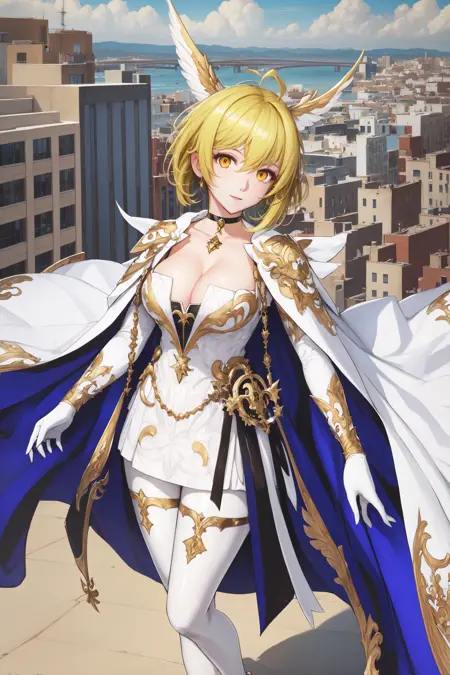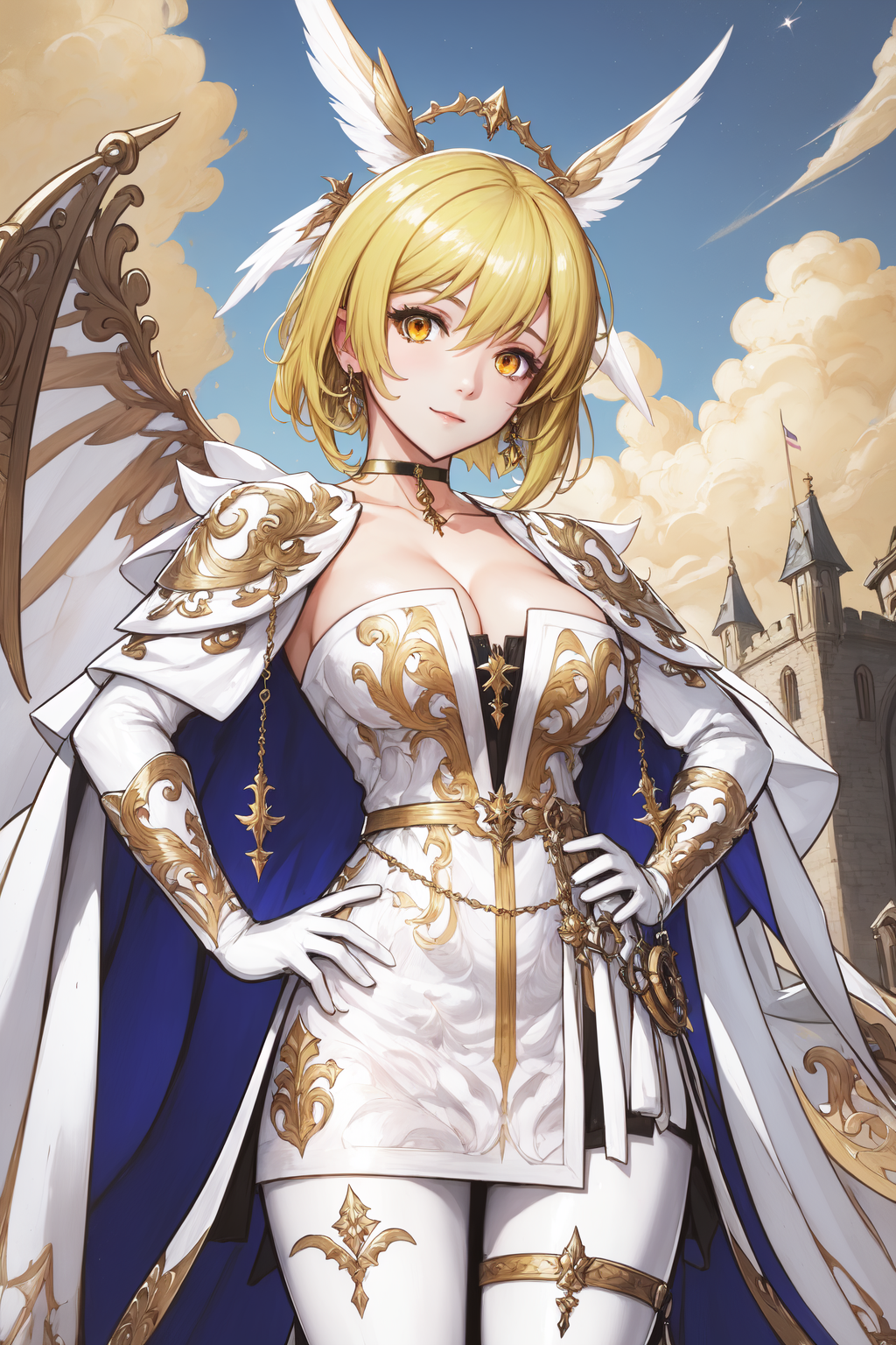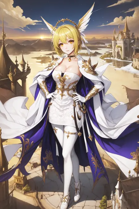myth_vanessa, strapless, 1girl, solo, blonde hair, yellow eyes, breasts, dress, white dress, short hair, cape, wings, choker, pantyhose, white cape, hair between eyes, gloves, white footwear, bangs, ahoge, cleavage