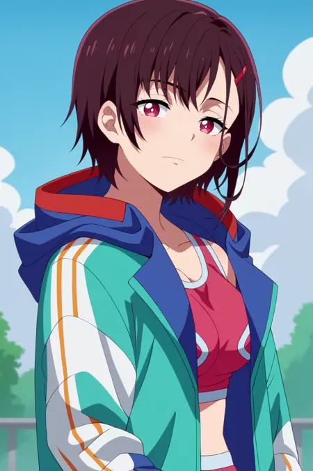 Triggers words : shizuka mikazuki, short hair, hood, jacket, hoodie, sports bras, sports short