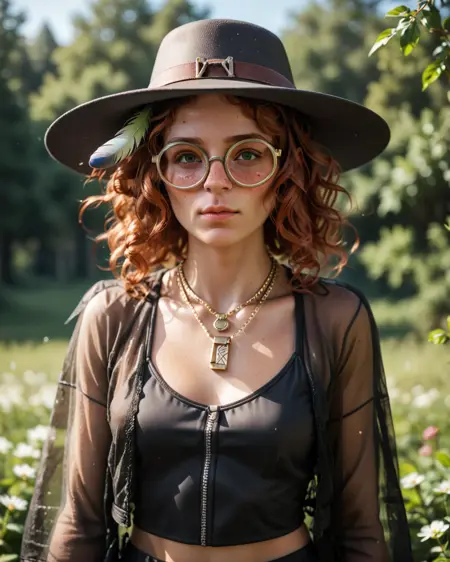 보조 트리거: 모자, 모자에 달린 깃털, 안경, 목걸이, 크랍탑, 투명한 재킷, 벨트, 검은 바지, 책을 들고 있는