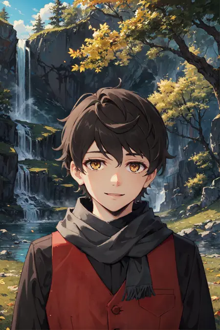 선택 사항: 빨간 조끼, 검은 셔츠, 긴팔, 스카프